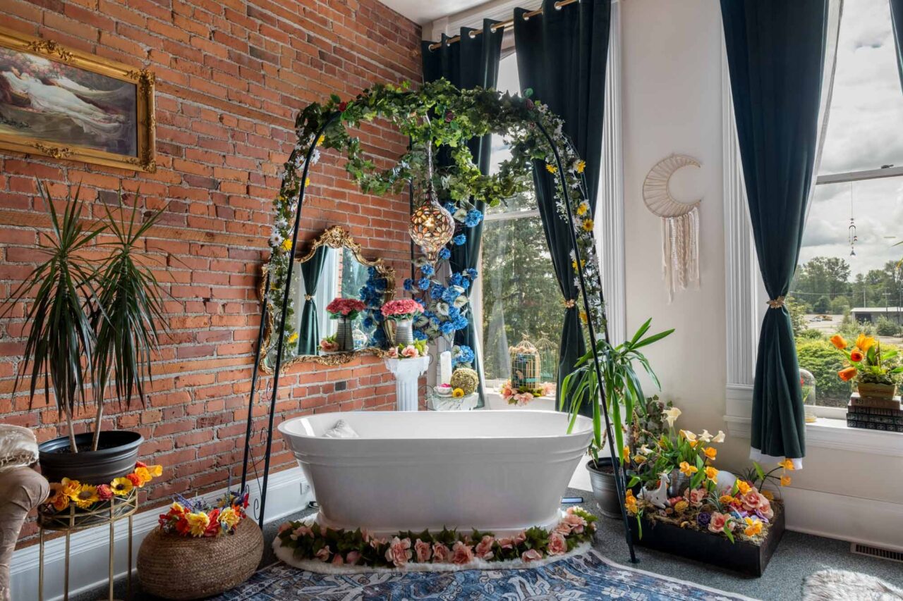The clawfoot tub rests against warm brick like a secret getaway tucked inside a fairytale. Every breath becomes an act of devotion. Every bubble feels like a love note written directly to your skin.