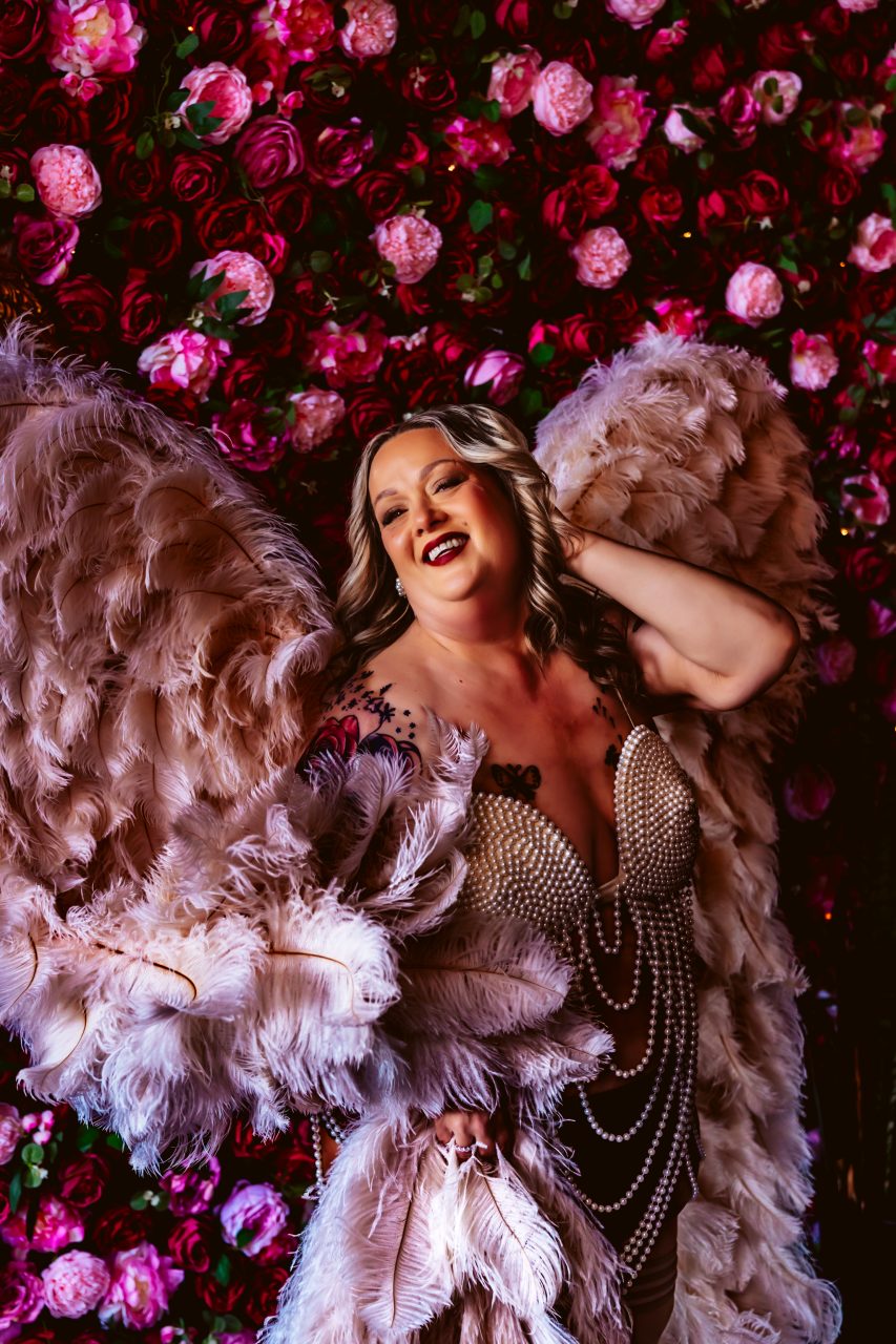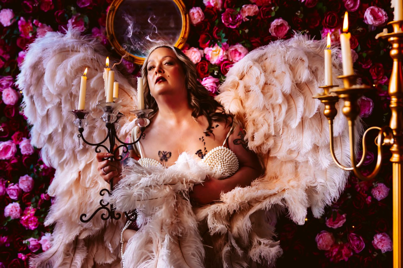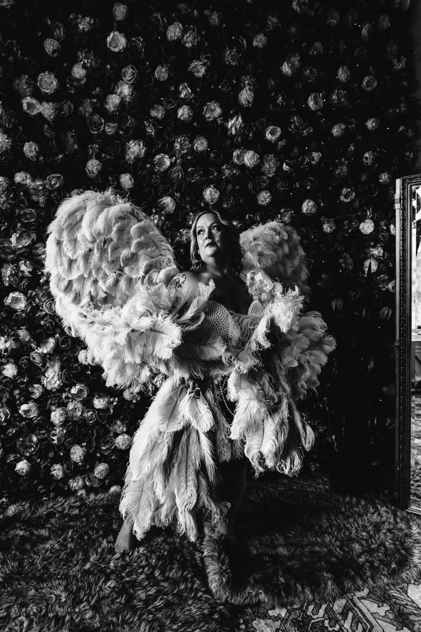 I love to read, I brought a book that was my first romance book I read as a teenager, that prop was used in the bedroom set with a blue lace body suit, the robe, sparkle tights and heels. I felt soft, relaxed, beautiful. Then the pearl bralette and angel wings. OH MY GOD, those WINGS! Definitely my favorite set. The mood, the mirror, the floral wall and candlelight, my heart was screaming GODDESS, DIVA, YESSSS GIRL, YESSS…LOL. I really came alive and let that inner Aries be front and center. She was a bad ass, lovely, sultry, sassy…