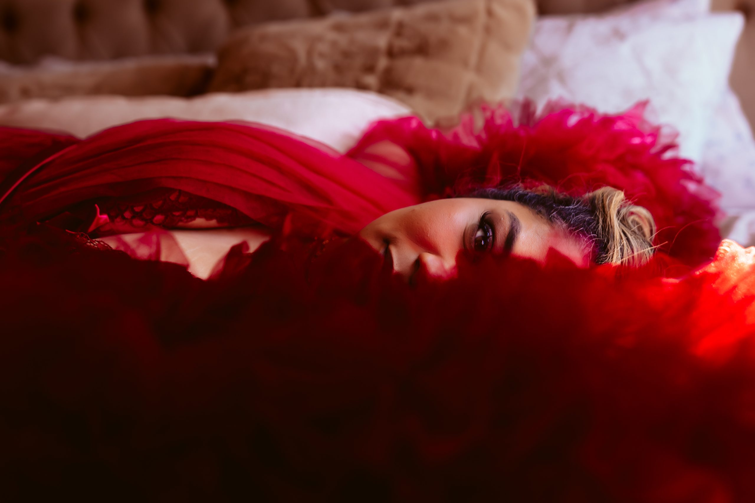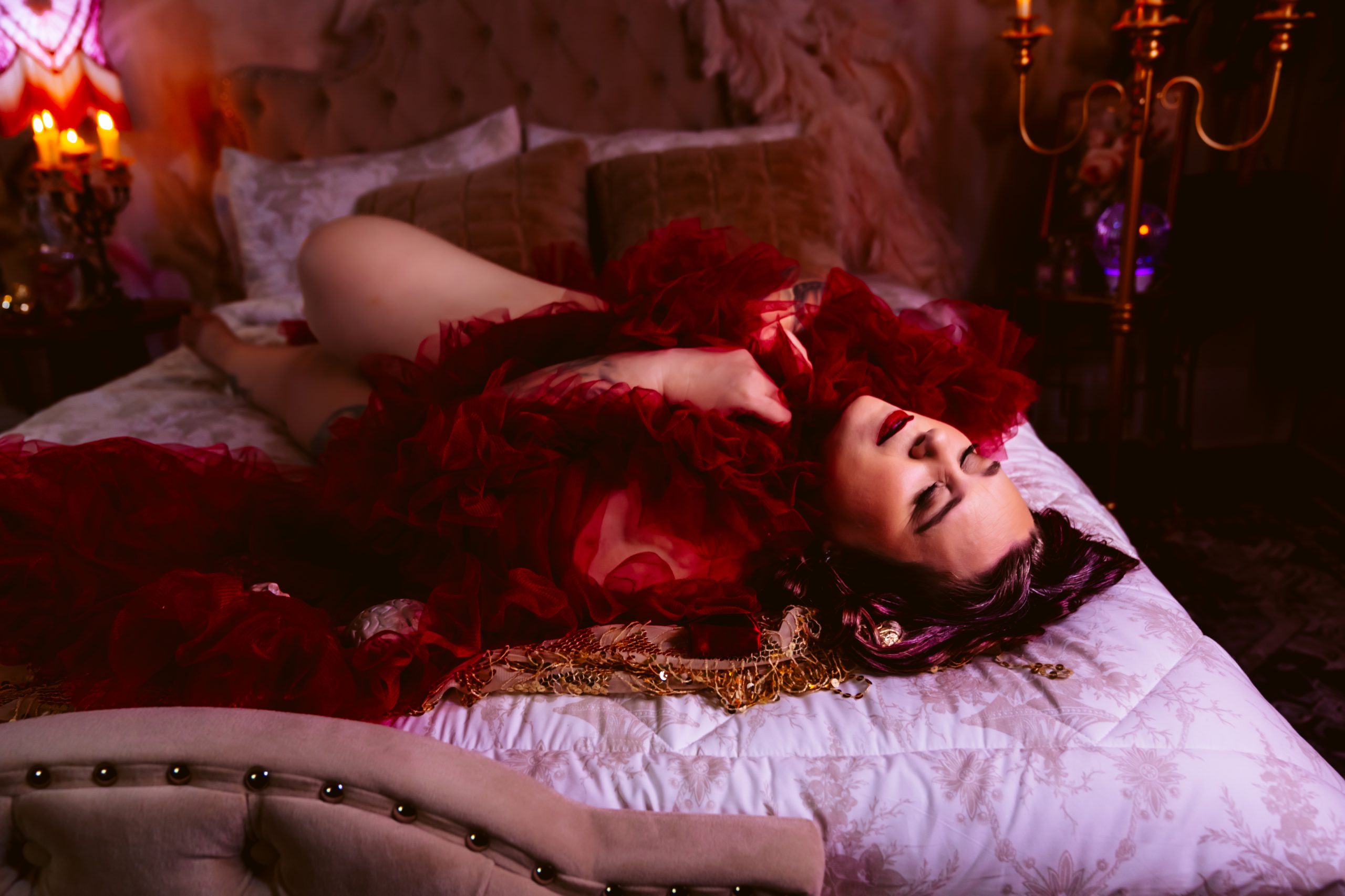 Soft Girl Rebellion boudoir session at Jezebel VonZephyr — angel wings, roses, playful confidence, and a woman stepping into her glow in Seattle, WA....